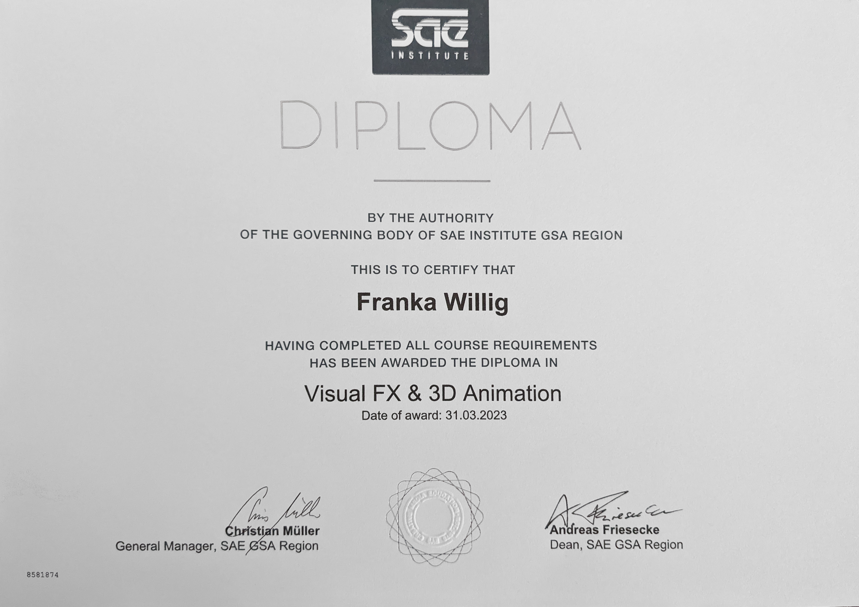 I am an Alumni of the SAE Institute Leipzig and a Graduate of the Middlesex University in the category VFX & 3D Animation. Previous to my studies I worked as a media designer for WIN Creating Images.